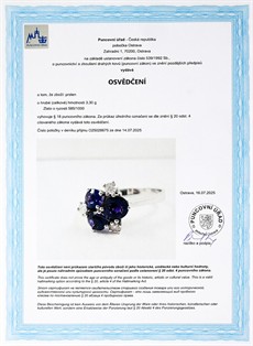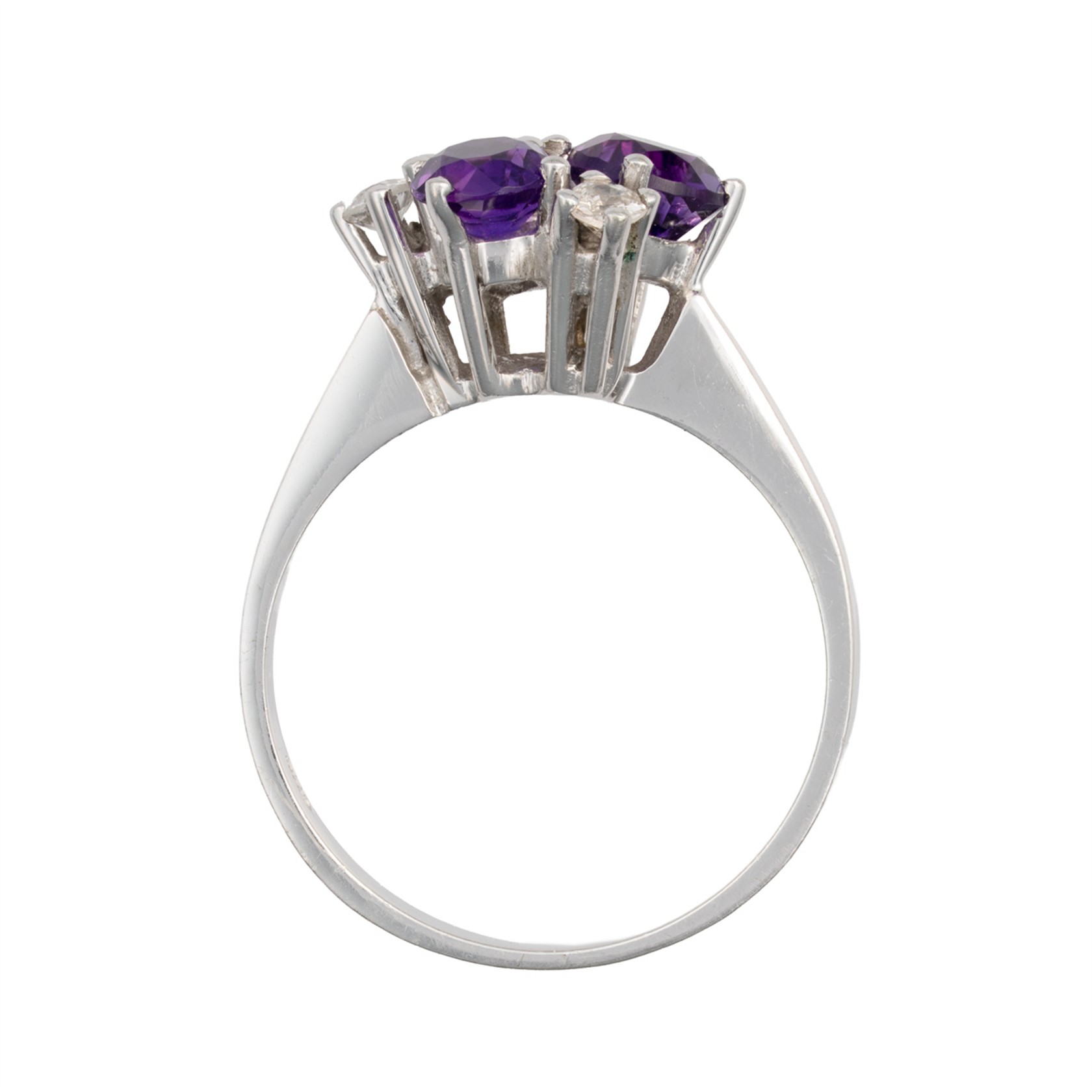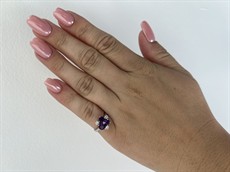 Zlato o ryzosti 585/1000 | váha 3,30 g | míry hlavy 1,1 x 1,1 cm | přírodní ametysty 3 ks 1,10 ct | přírodní diamanty 3 ks 0,18 ct | velikost 52 | výborný stav | osvědčení puncovního úřadu | kameny zkontrolovány v gemologické laboratoři