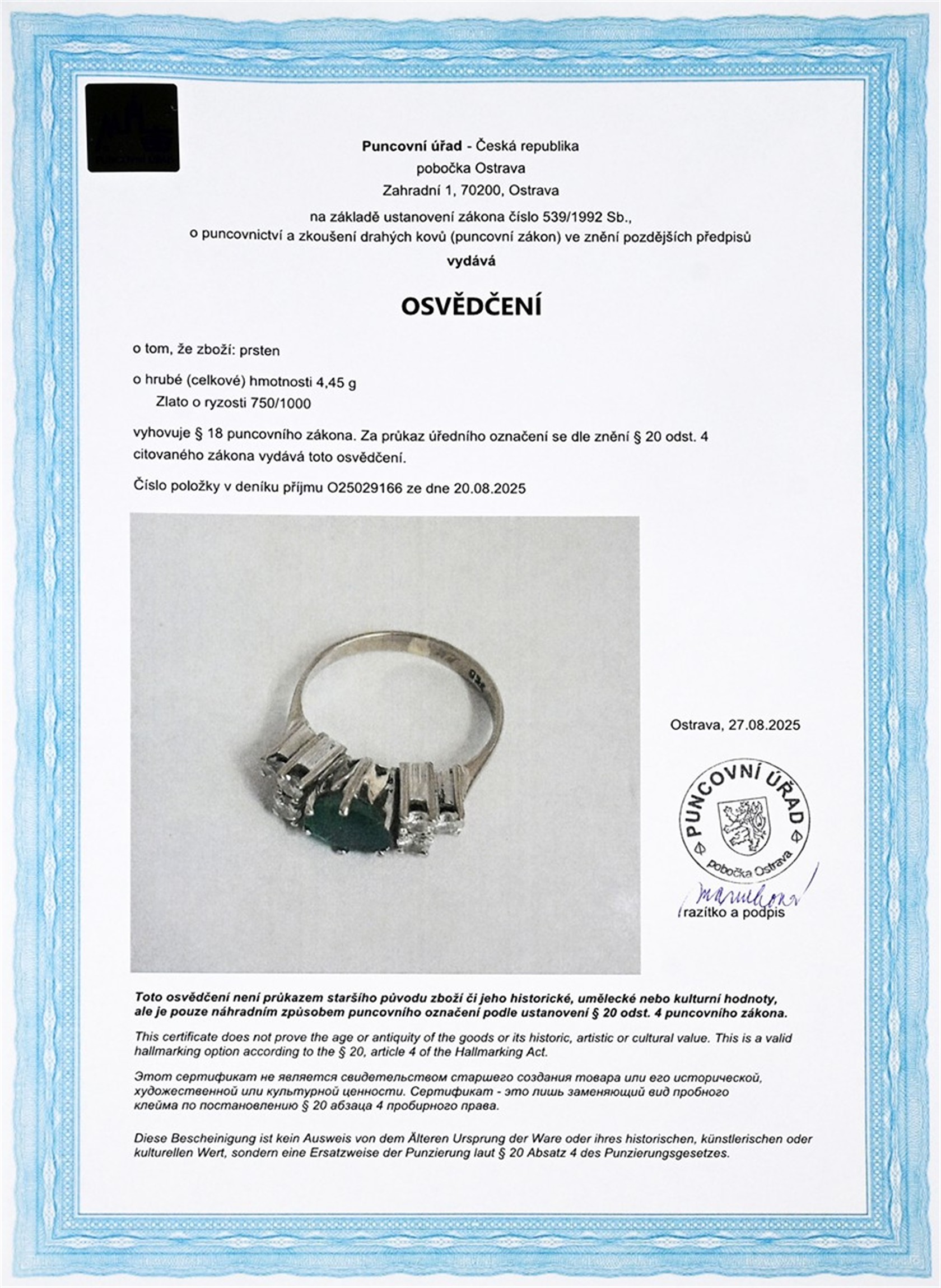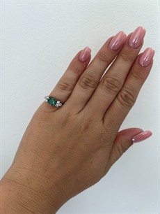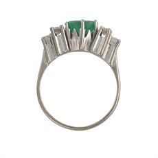 Zlato o ryzosti 750/1000 | váha 4,45 g | velikost 50 | míry hlavy 1,7 x 0,6 cm | míry přírodního smaragdu 7,15x5,9x3,45 mm | míry přírodního diamantu 2 ks průměr 2,9 mm, 4 ks průměr 2,6-2,7 mm, celkem cca 0,40 ct | výborný stav | osvědčení puncovního úřadu | kameny zkontrolovány v gemologické laboratoři