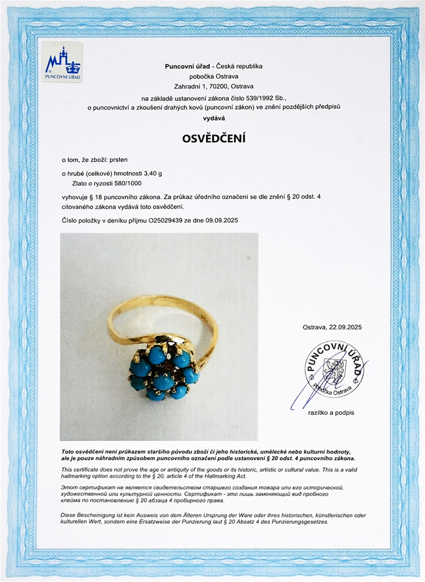 Zlato o ryzosti 580/1000 | váha 3,40 g | průměr hlavy 1,2 cm | velikost 55 | výborný stav | osvědčení puncovního úřadu | kameny s garancí pravosti zkontrolované v gemologické laboratoři