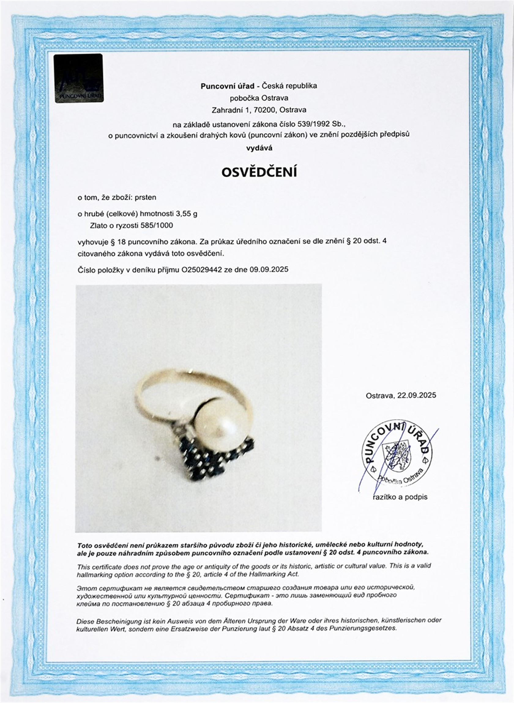 Zlato o ryzosti 585/1000 | váha 3,55 g | přírodní safíry 7 ks 0,35 ct | velikost 50 | výborný stav | osvědčení puncovního úřadu | kameny s garancí pravosti zkontrolované v gemologické laboratoři