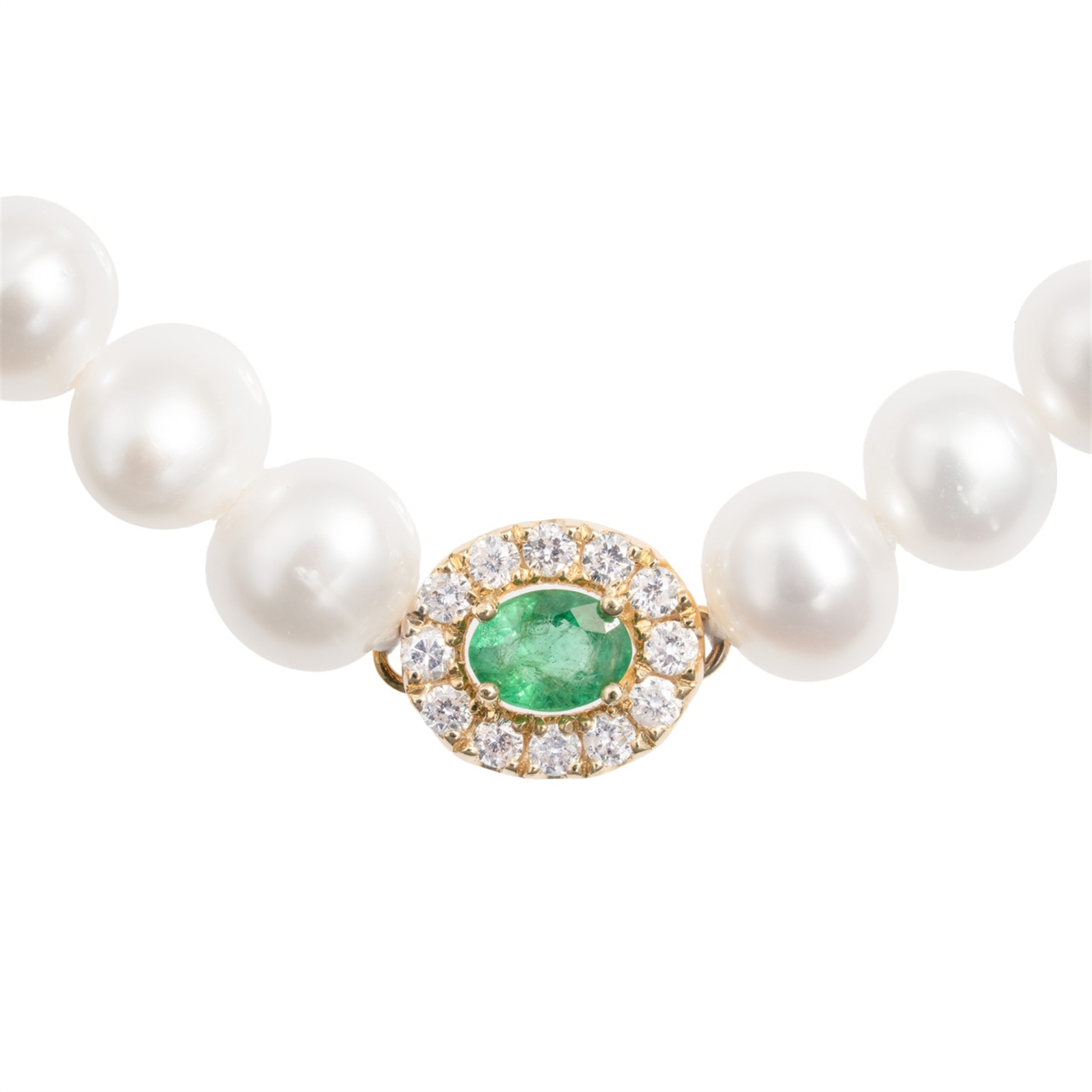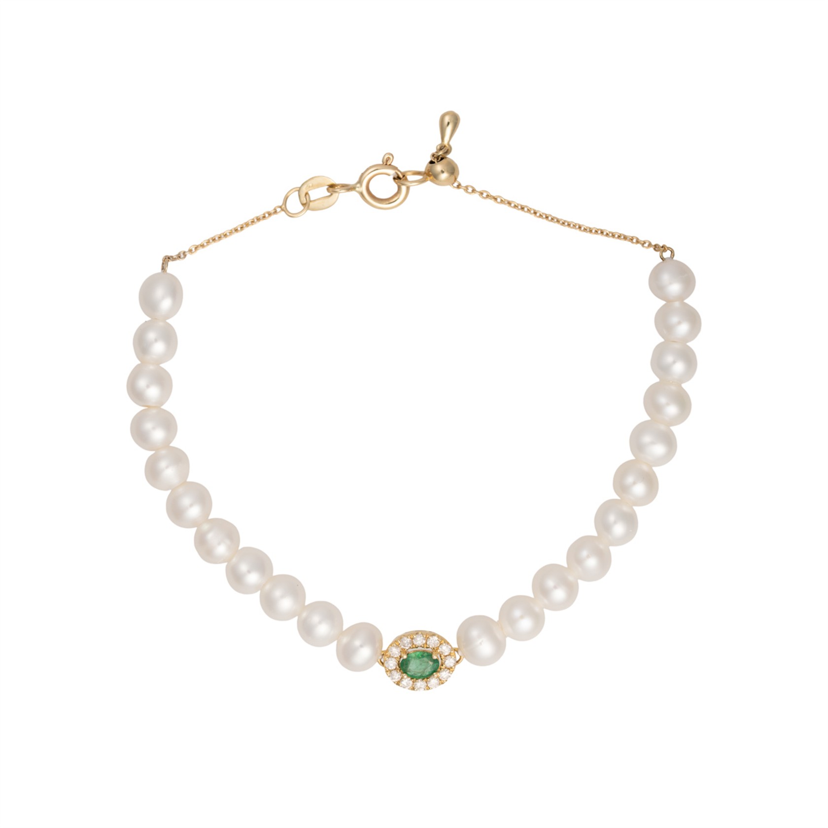 Zlato o ryzosti 585/1000 | váha 4,50 g | míry 0,8 x 0,6 cm | délka 17 cm | průměr perly 0,4 cm | smaragd 0,10 ct | diamanty 0,10 ct | 22 perel | výborný stav | nová práce | puncováno platným puncem