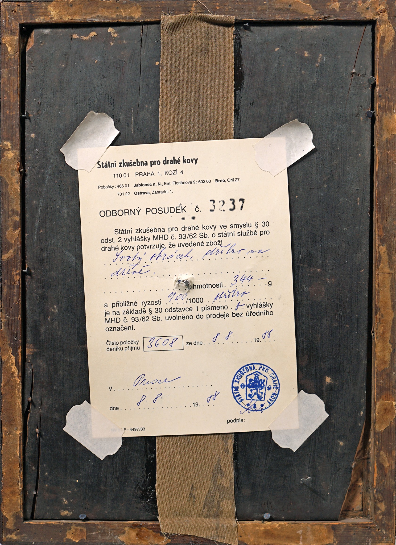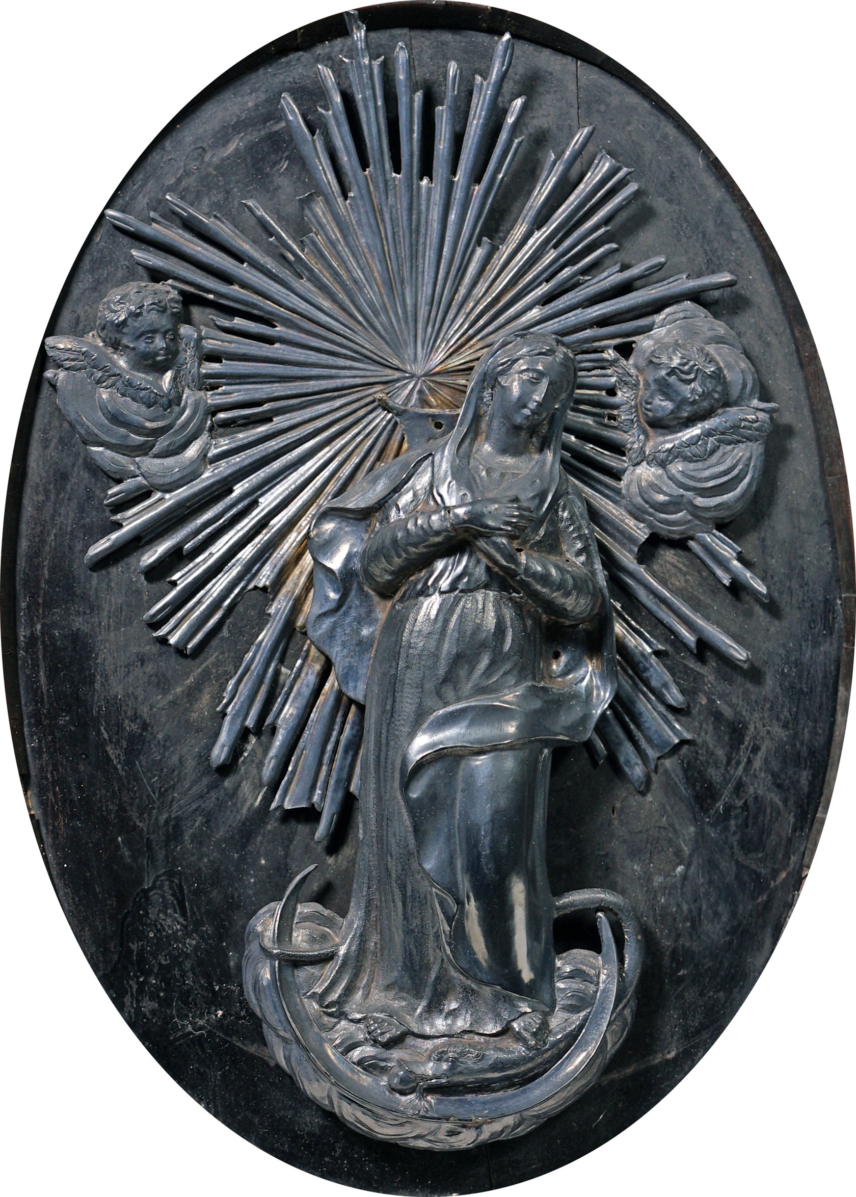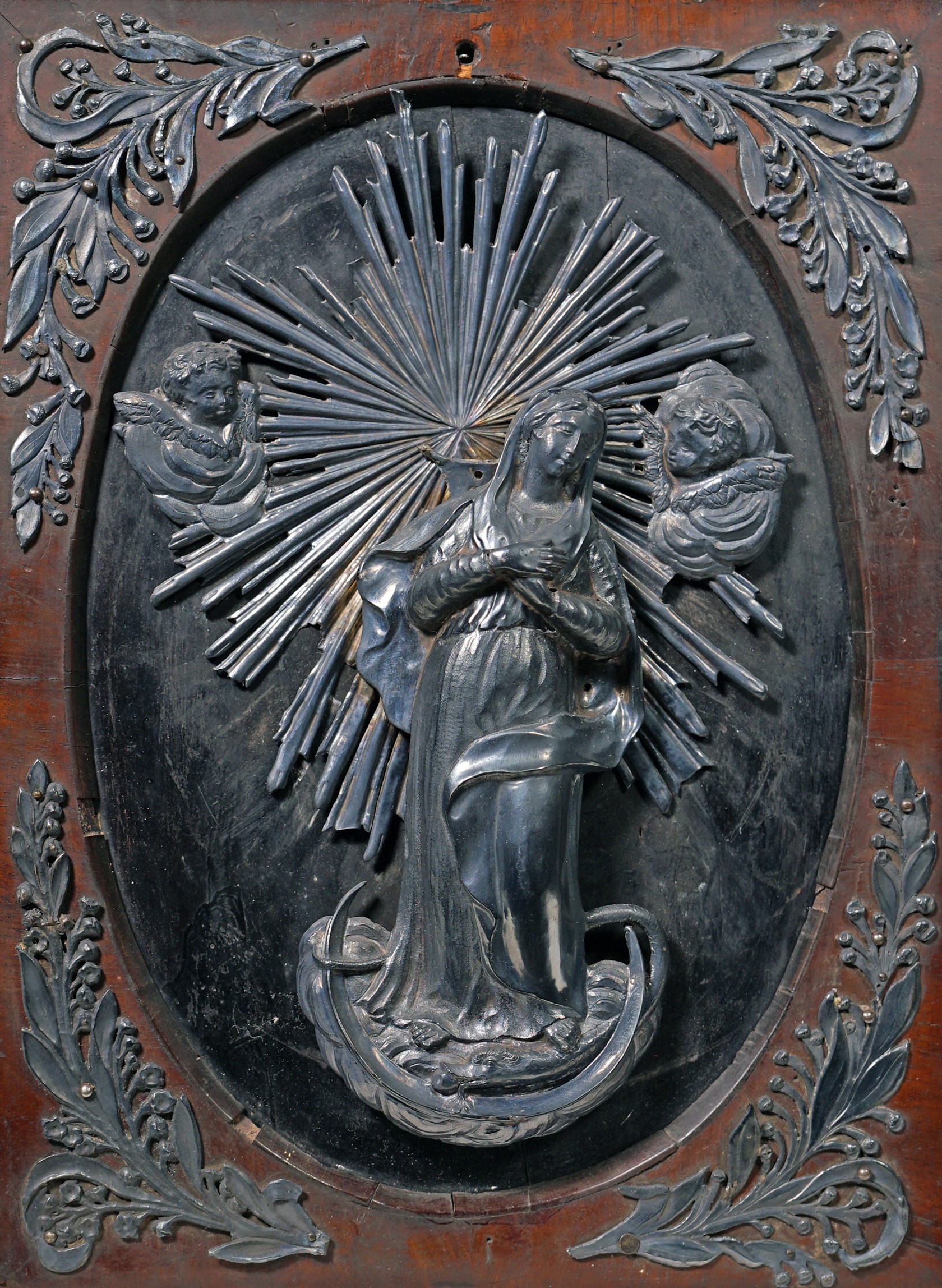 Stříbrný reliéf madony. Vyhotoven atest z puncovního úřadu.