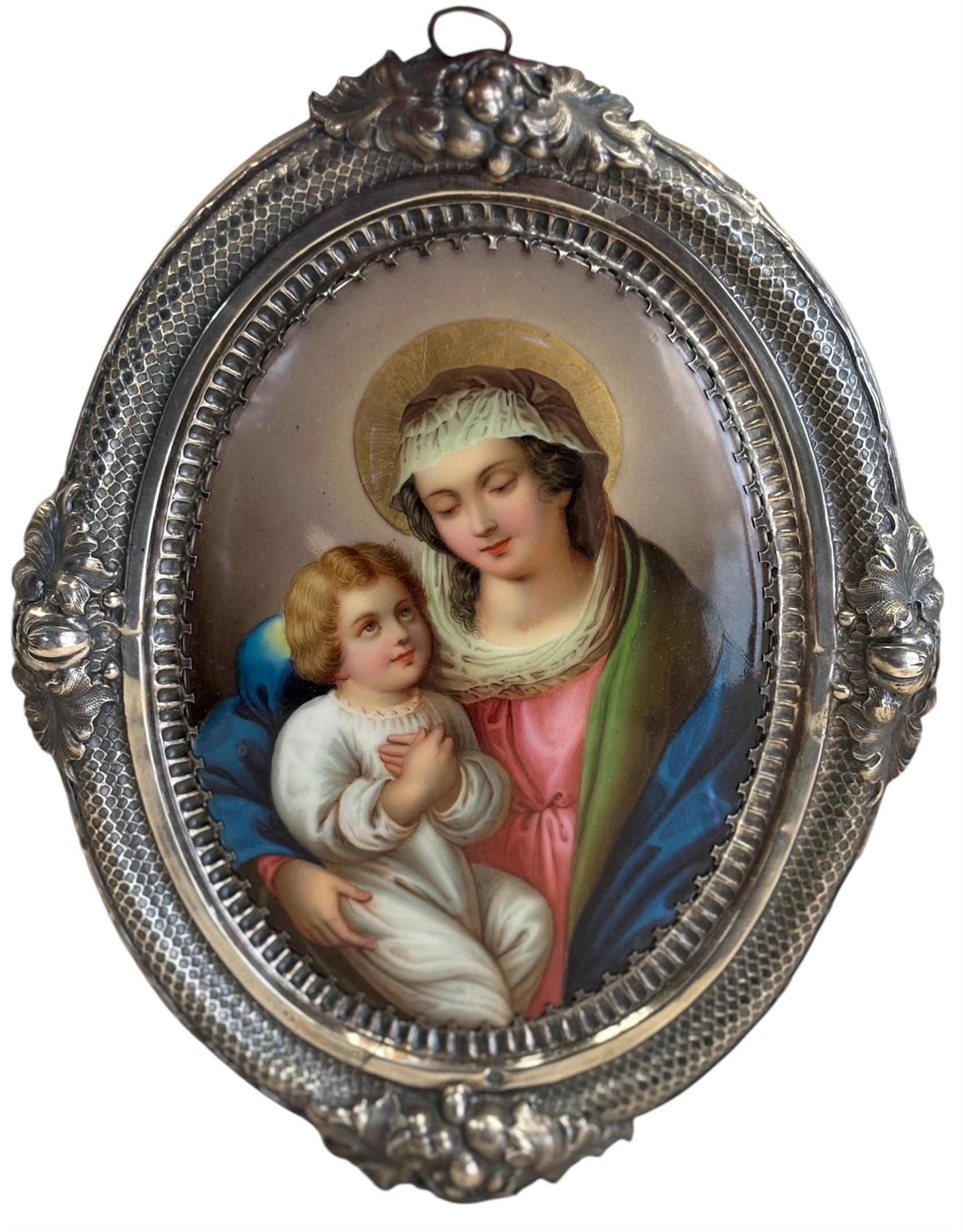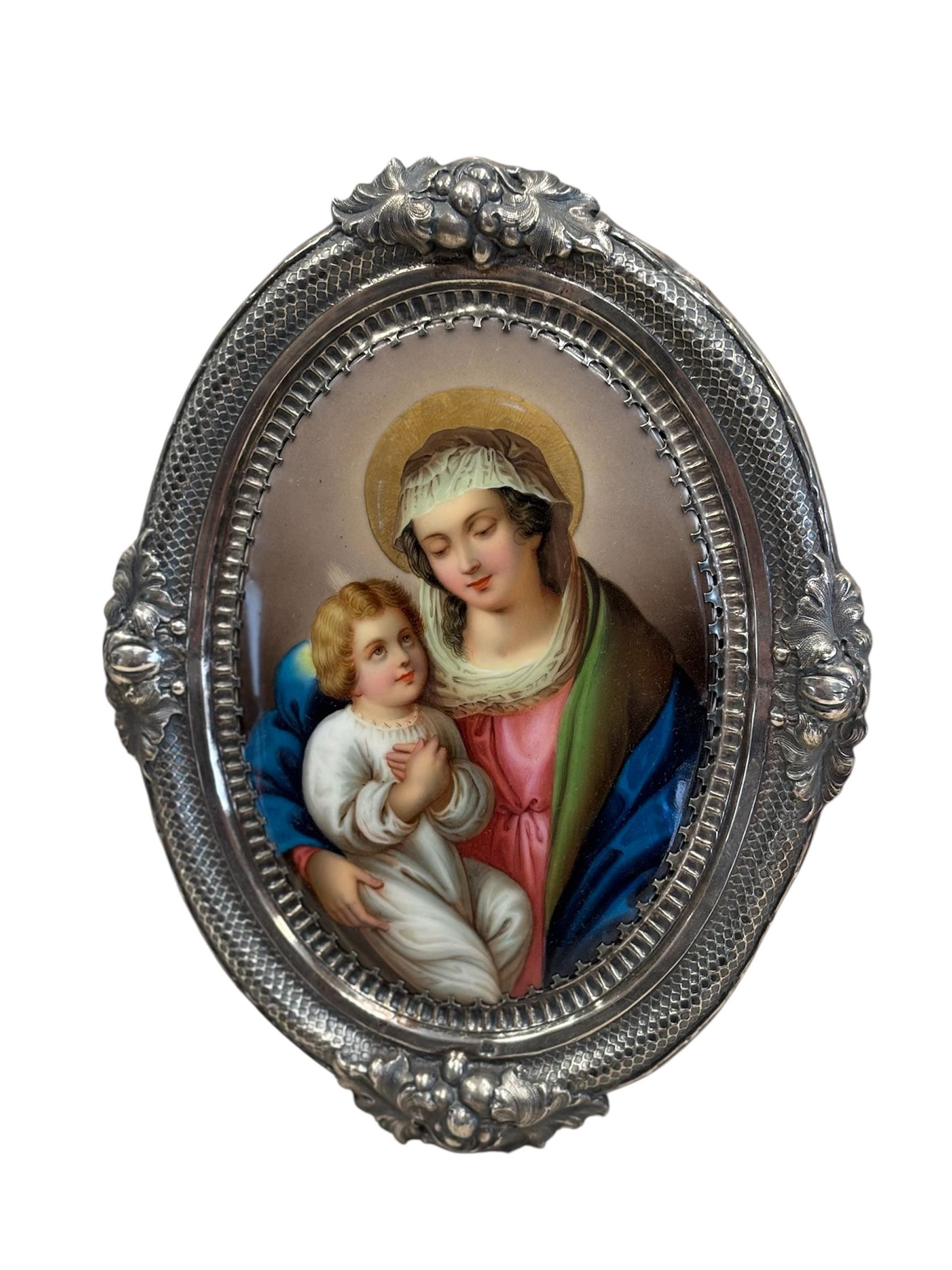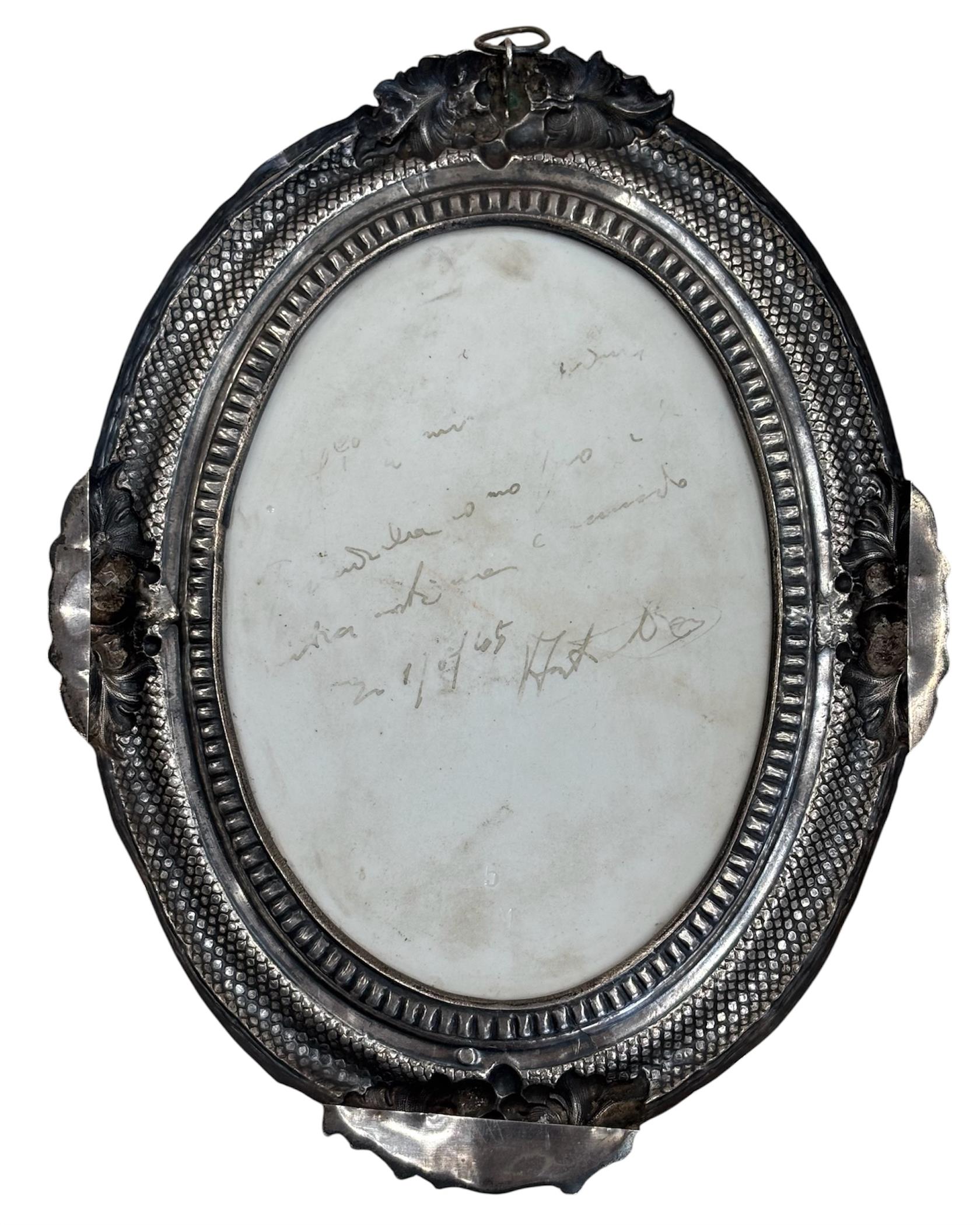 Malba na porcelánu ve stříbrném rámečku. Práce 19. století. Vyhotoven atest z puncovního úřadu. Luxusní práce 19. století.