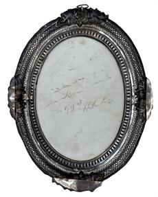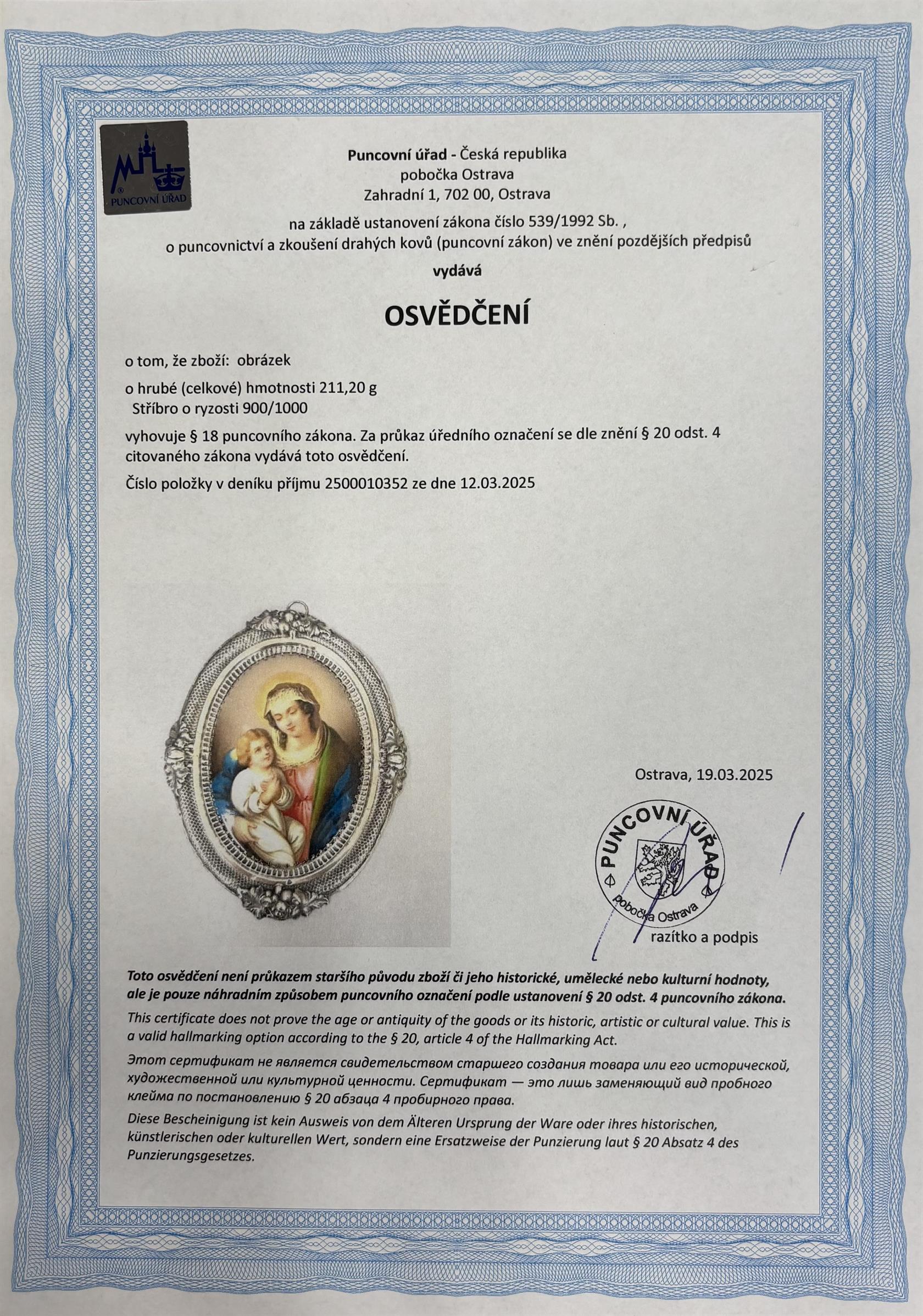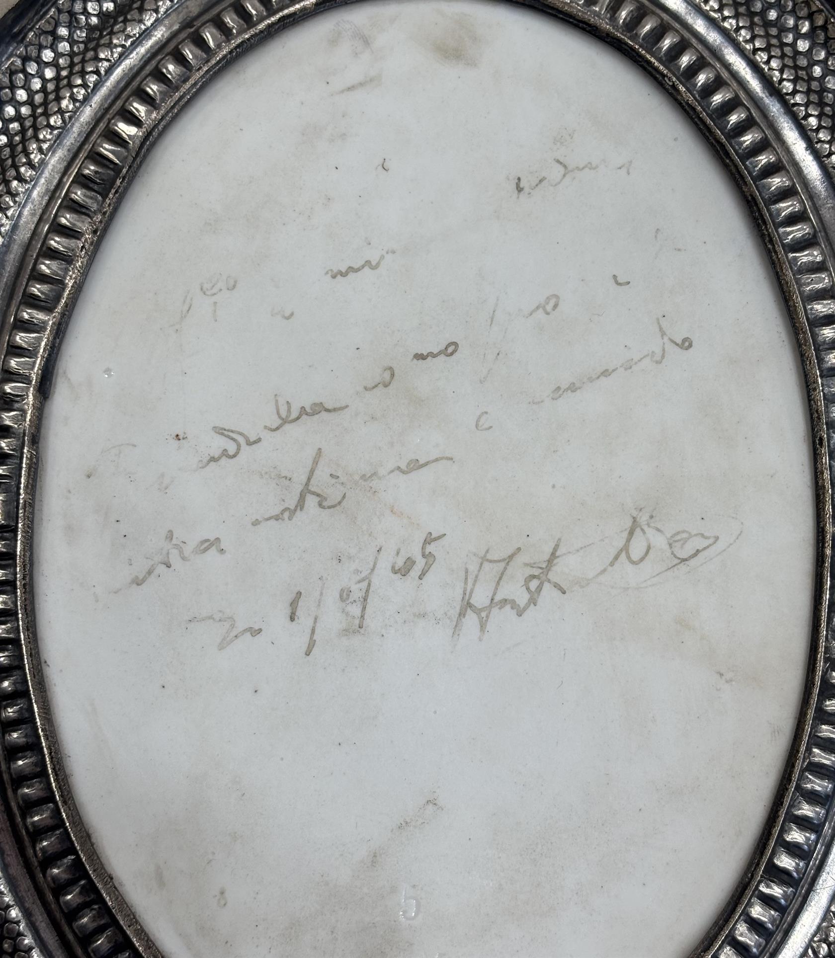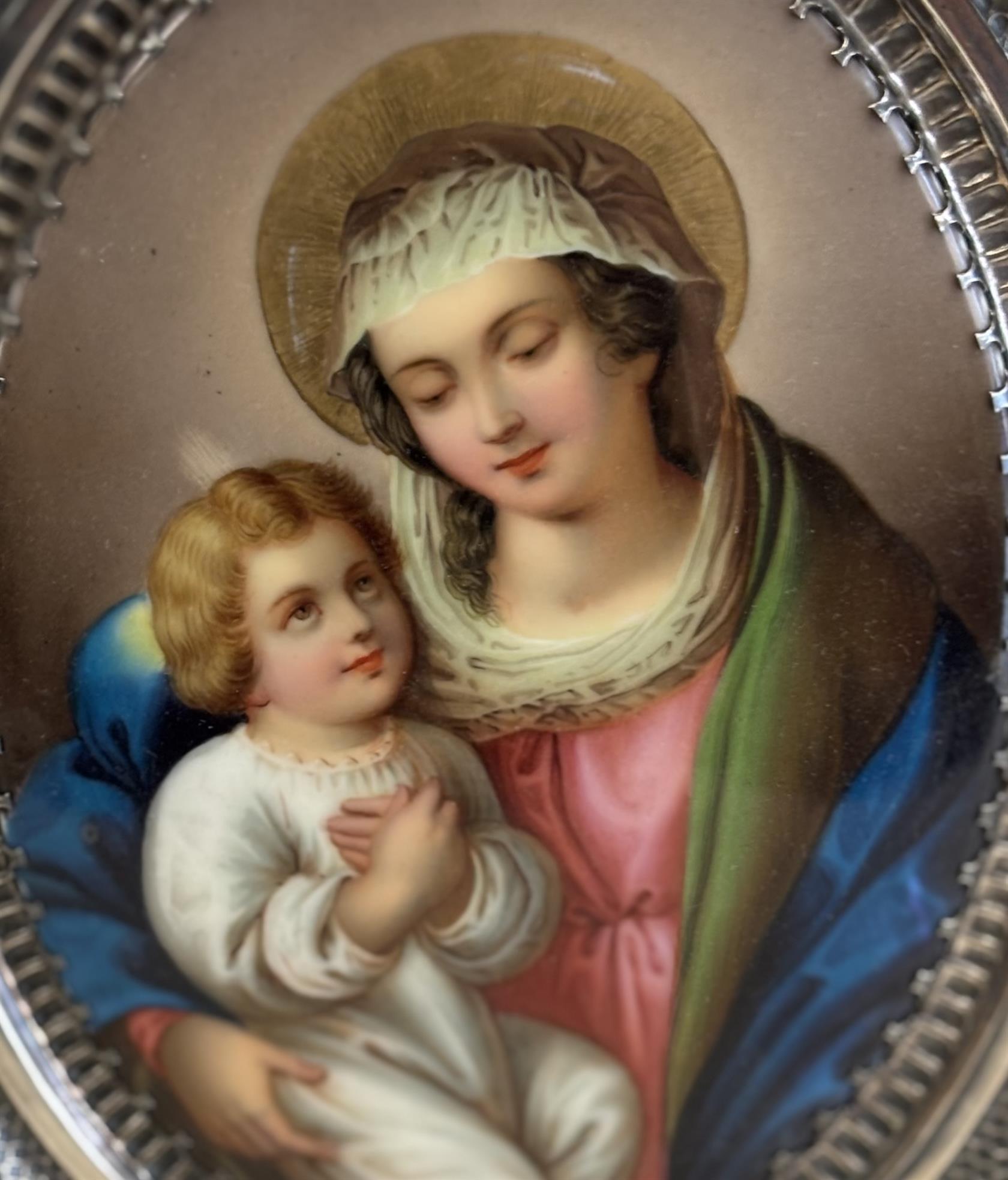Malba na porcelánu ve stříbrném rámečku. Práce 19. století. Vyhotoven atest z puncovního úřadu. Luxusní práce 19. století.