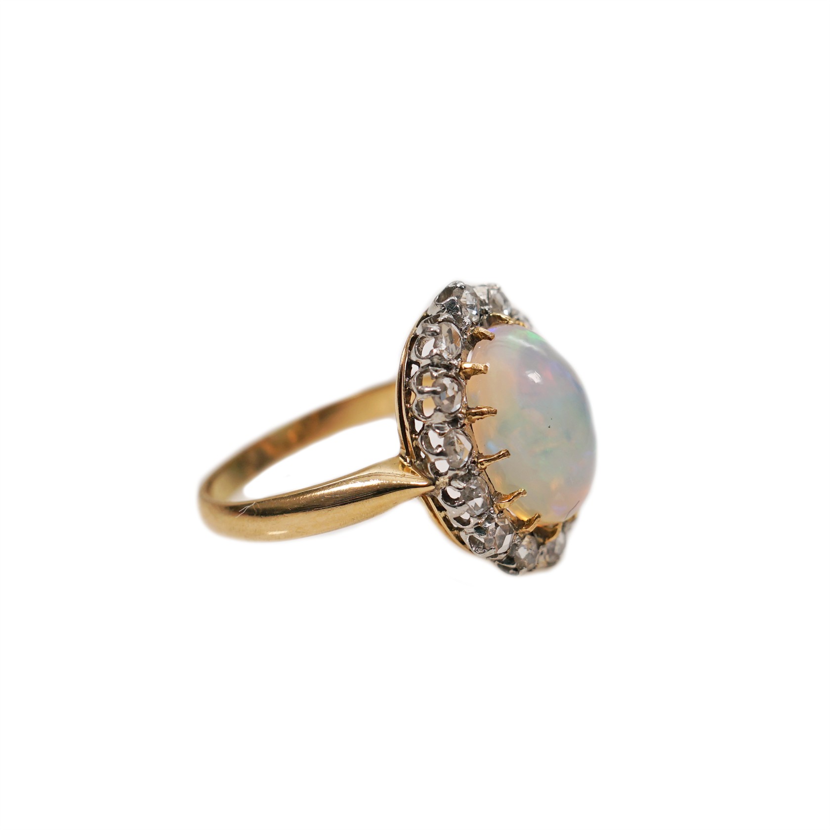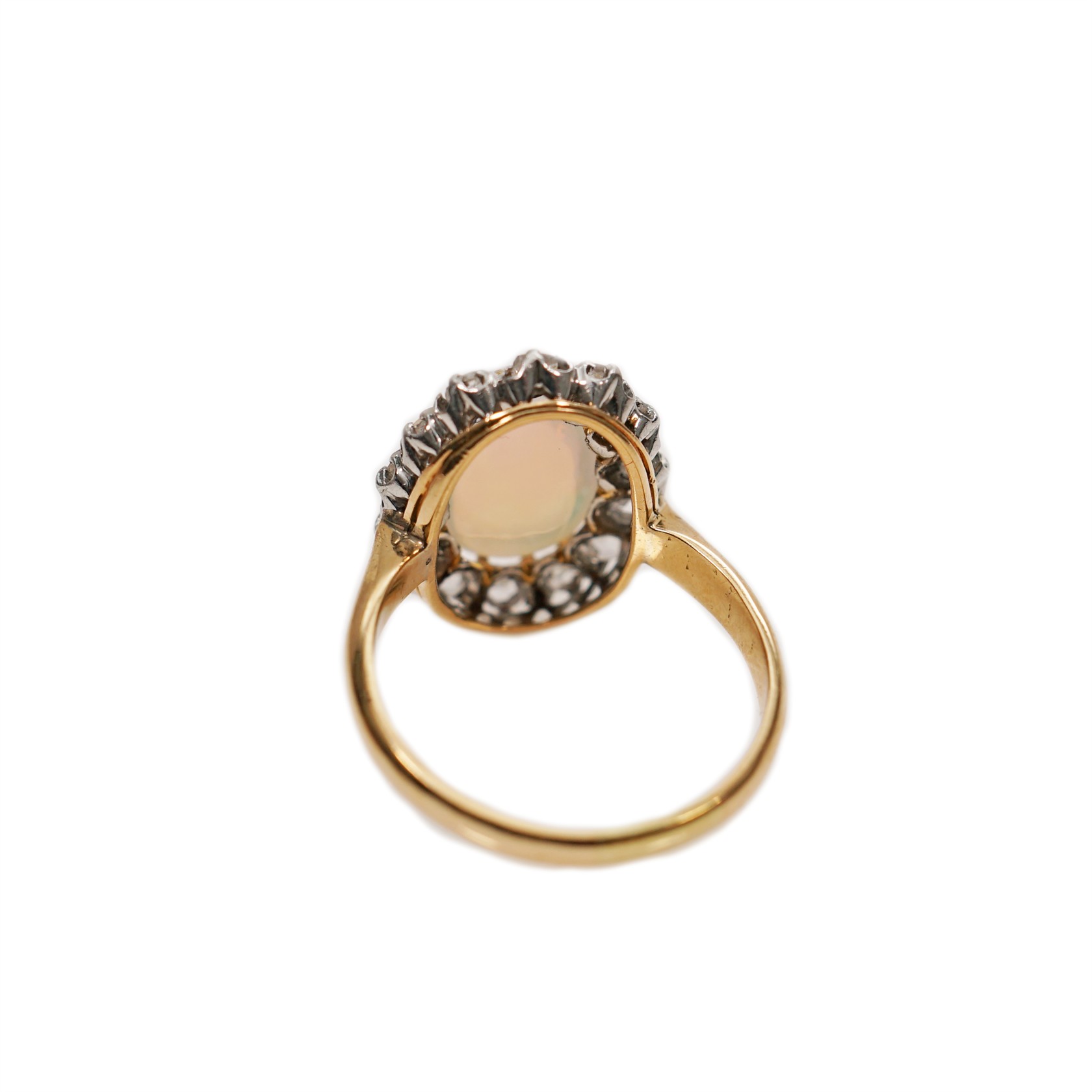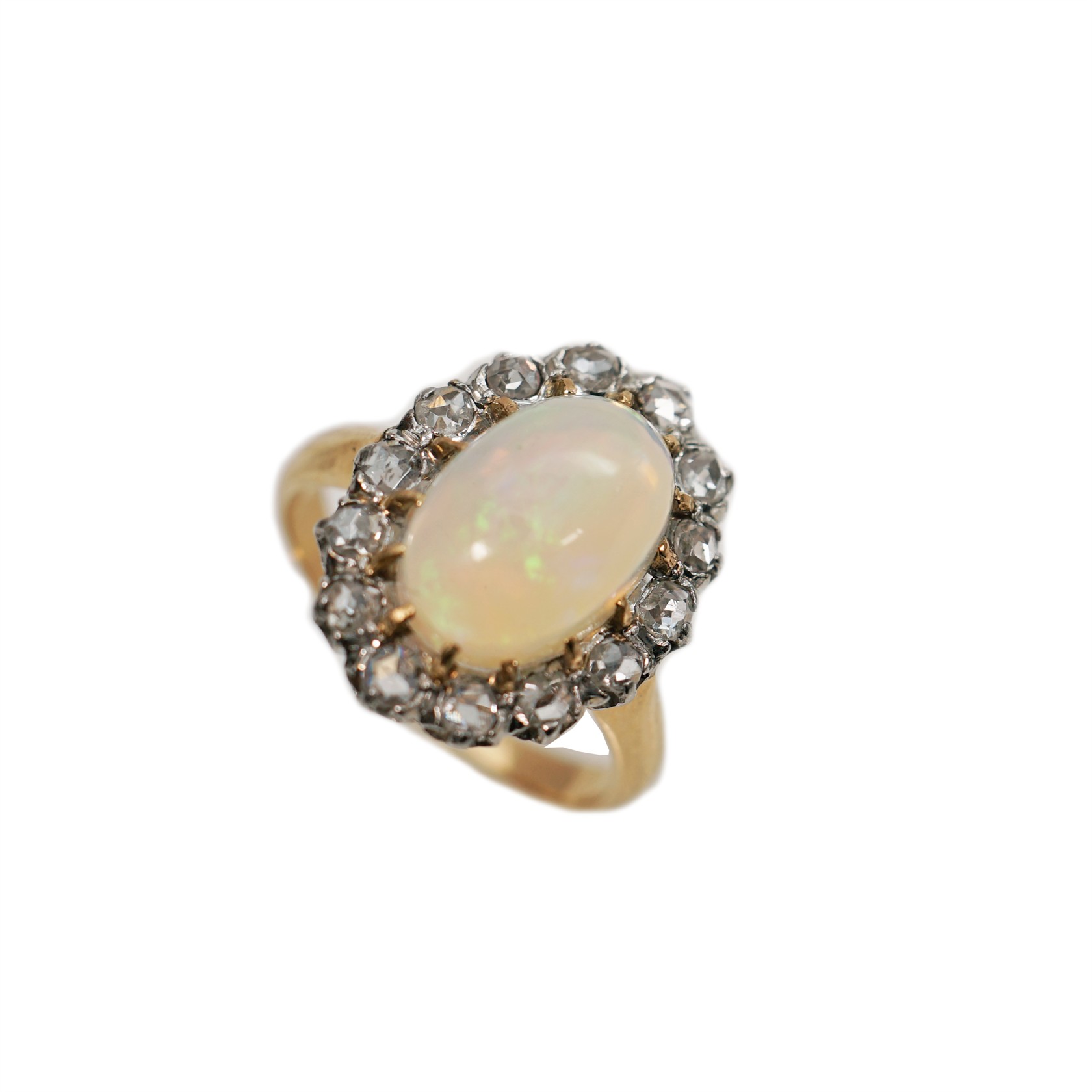18 karátové zlato. Osazeno brilianty a opálem. Kolem roku 1900. Váha 5,00 g / 750. Velikost prstenu č. 50