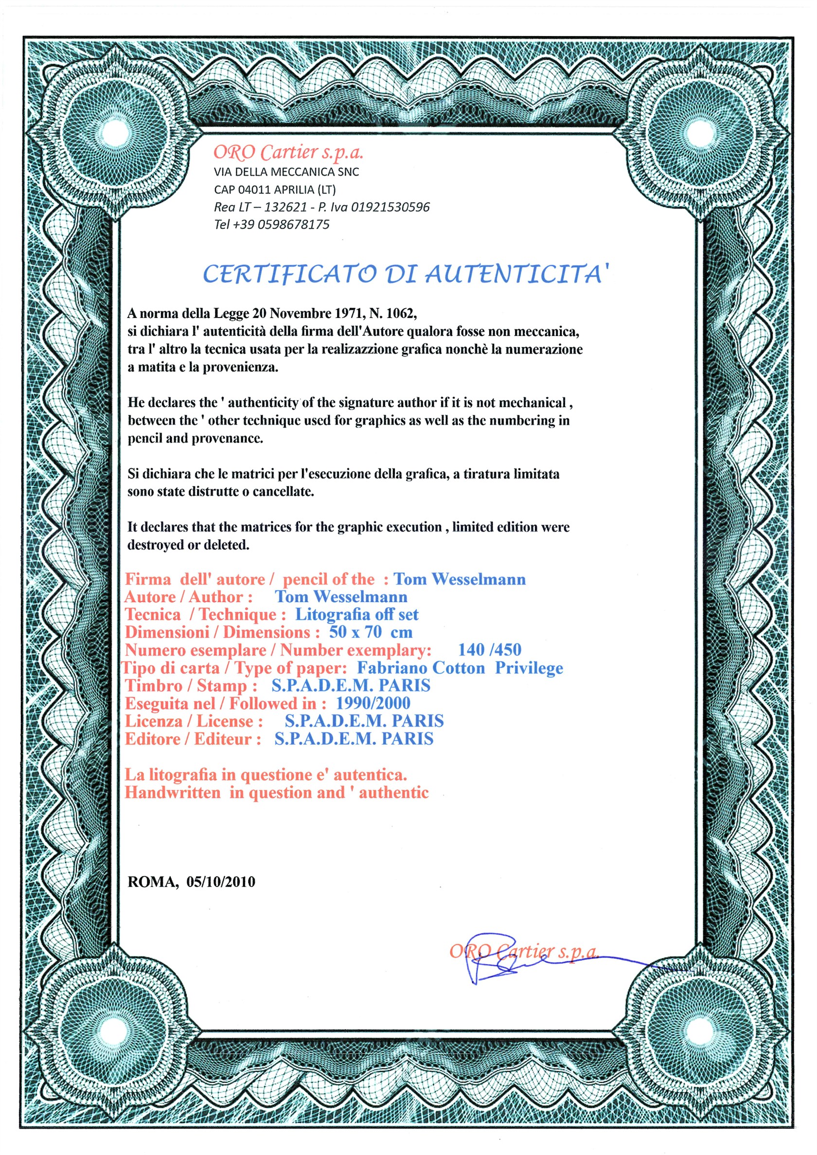 Součástí je originální certifikát