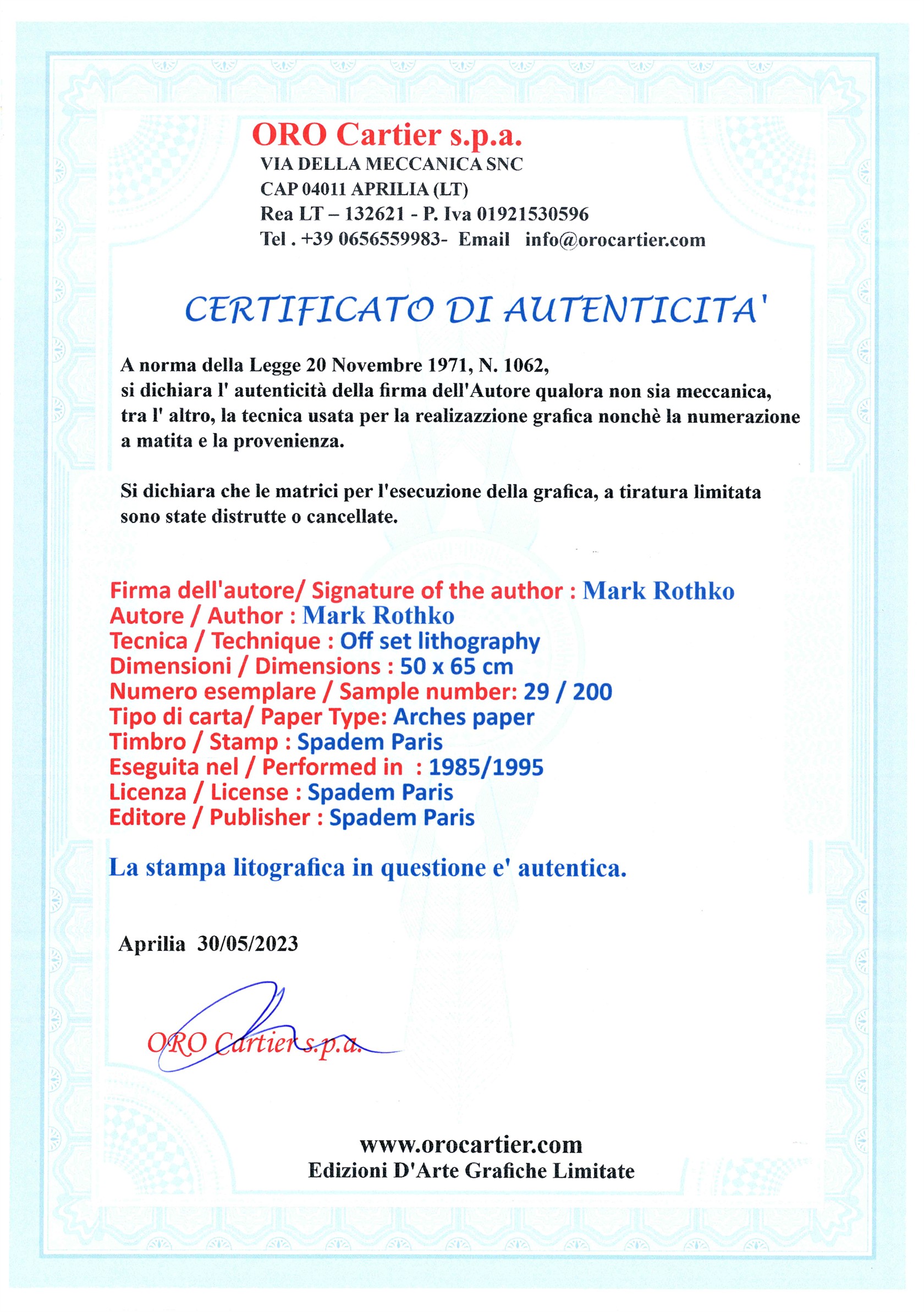 Součástí je originální certifikát