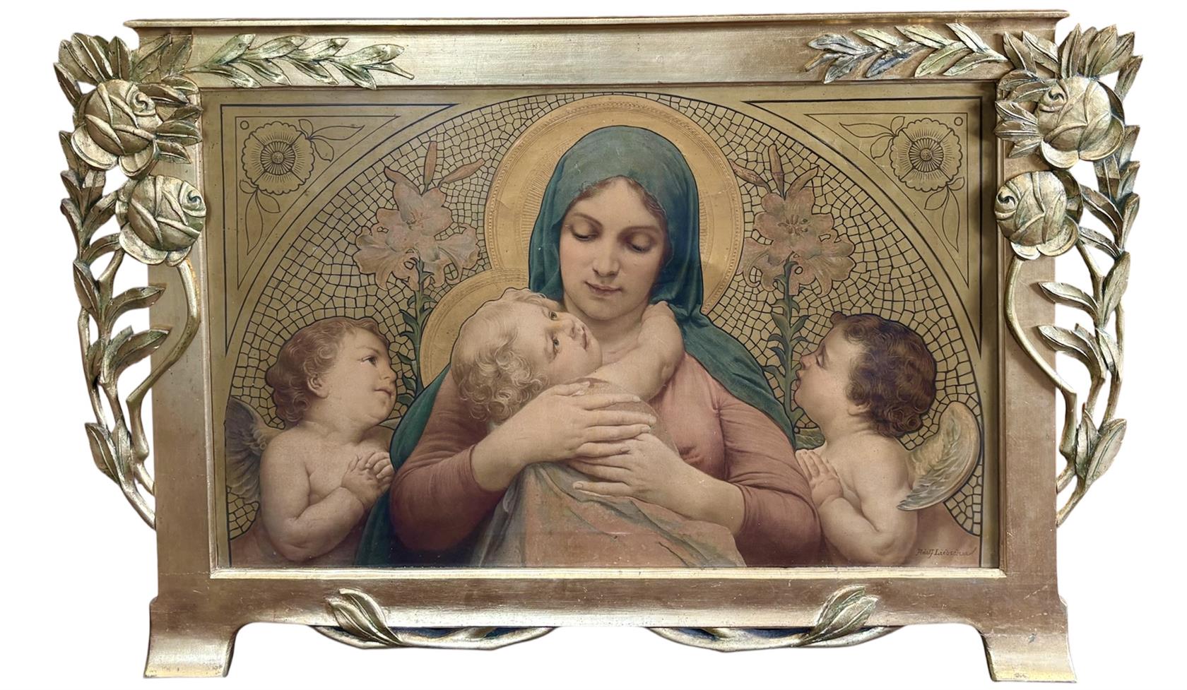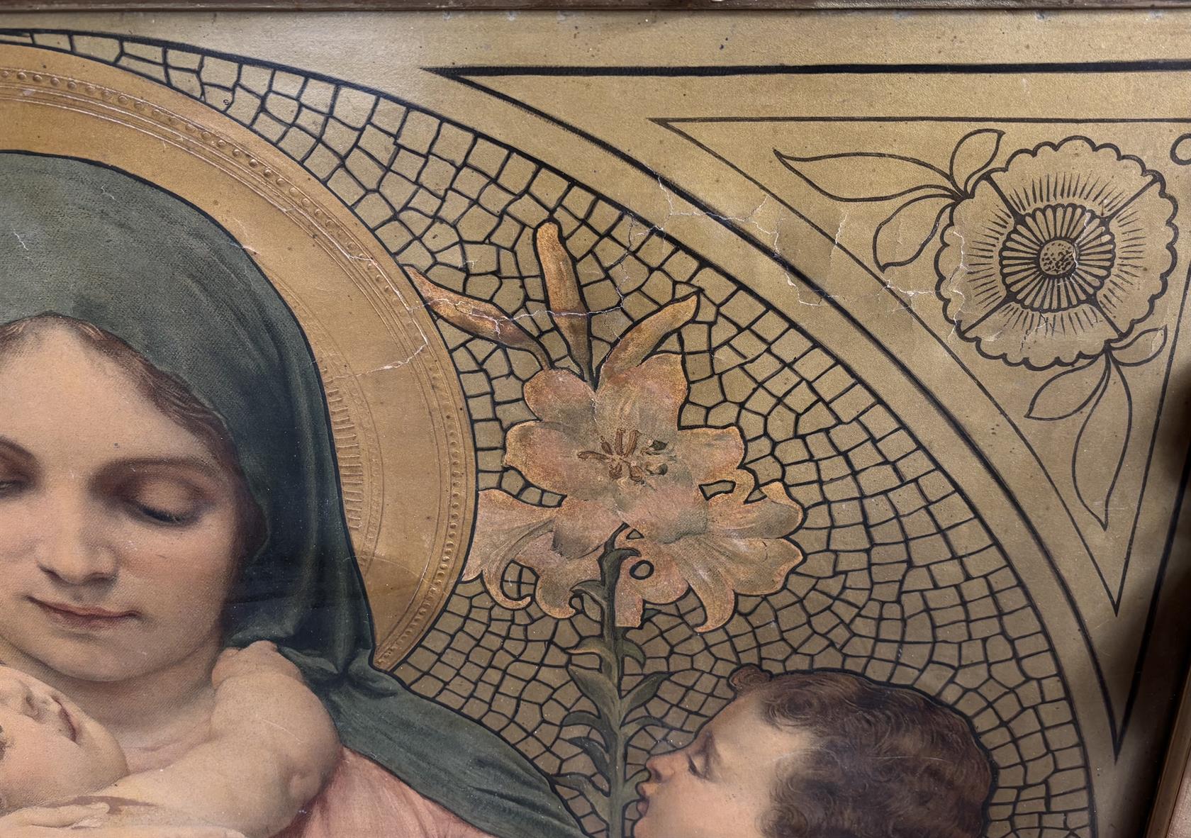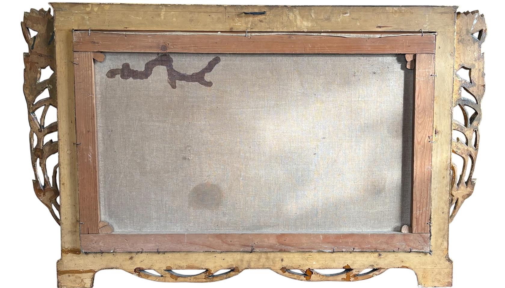 Papír na plátně, mírně poškozeno - viz foto. Secesní ručně řezaný rám.